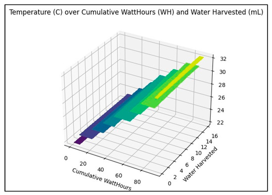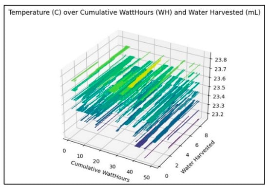 With a baseline established using a traditional desiccant wheel design, the next area of interest was observing its long-term capabilities. The desiccant wheel harvester’s temperature peaked at an average of 32.26 °C by the end of testing (Figure 8). The mean current used was 7.7 ± 0.14 A. At 24 V, the average highest power used by the desiccant harvester was 184.8 ± 3.36 W.