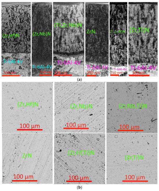 Figure 1a shows the structures of the studied coatings. Coatings containing both titanium and zirconium have a nanolayer structure, while coatings that do not contain titanium have a monolithic structure. The coating thickness is 1.4–1.5 µm. The surface morphology of the coatings (Figure 1b) is quite identical, with a small amount of microparticles observed.