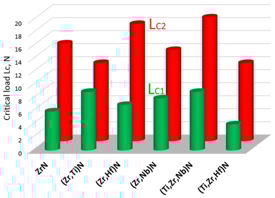 Below are the quantitative results of the study of the coatings using the scratch test method (Figure 2). The values of the critical points LC1 and LC2 were determined by comparing the acoustic emission data and the results of studying the scribe groove using SEM. The (Ti,Zr,Nb)N and (Zr,Hf)N coatings showed the greatest strength, and the (Zr,Ti)N, (Ti,Zr,Hf)N and (Zr,Nb)N coatings deteriorated the fastest.