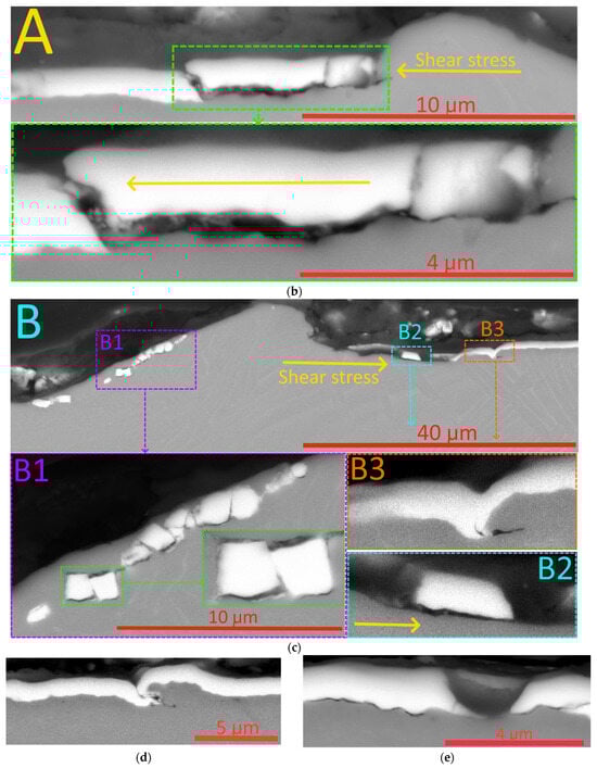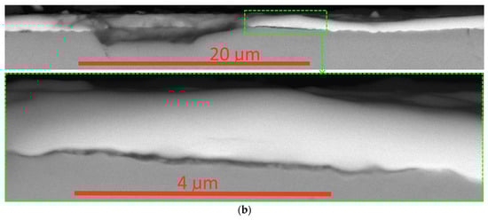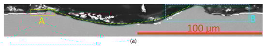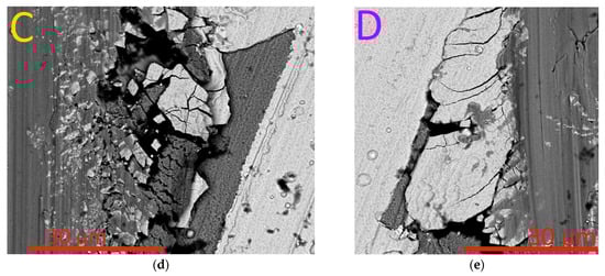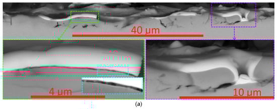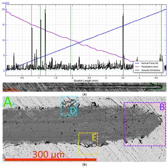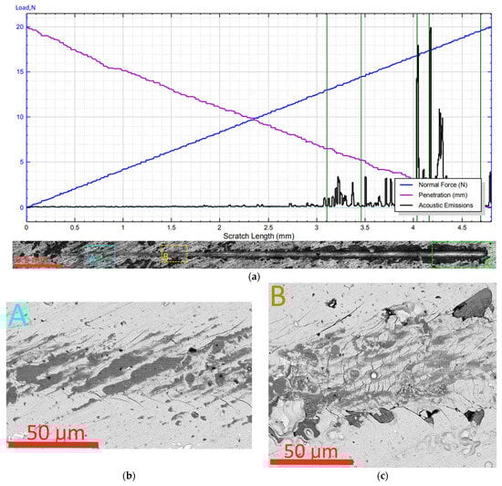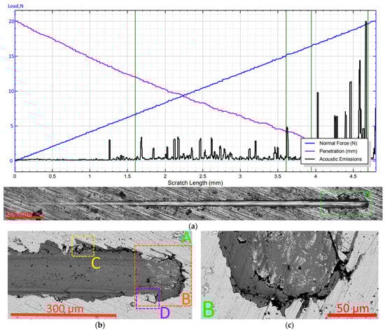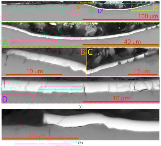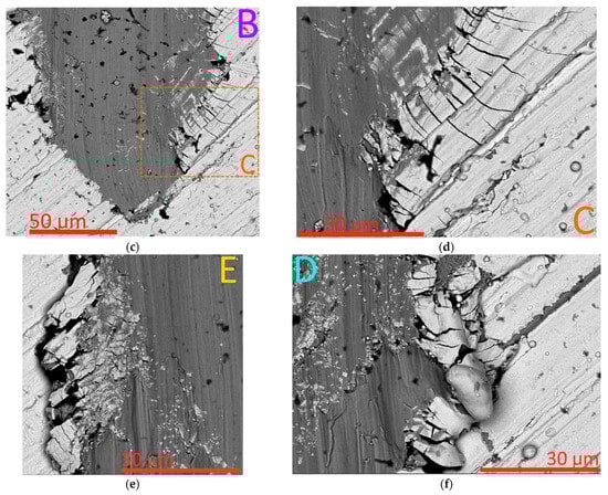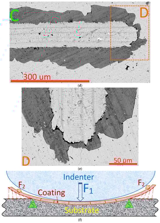 The above assumptions are largely confirmed by examining a cross-section taken perpendicular to the scribe groove in the area close to point LC2 (Figure 8). In particular, the coating in the area of the bottom of the scribe groove (area D, Figure 8a) maintains its integrity (despite several transverse cracks). There are no signs of the peeling of the coating from the substrate in this area. At the same time, at the boundaries of the groove (areas B and C, Figure 8a,b), the peeling of the coating from the substrate is observed, and behind the delamination area there is an area in which the coating is completely absent.