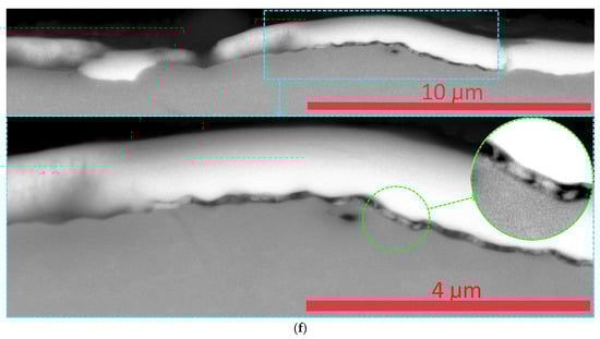 Data on good adhesion to the substrate are also confirmed by the results obtained when studying a transverse section running perpendicular to the scribing groove (Figure 14). In particular, even under conditions of significant plastic deformation of the substrate, the adhesive bond between the coating and the substrate is maintained (Figure 14a,b). In this case, transverse cracks are formed in the coating, passing into the substrate (Figure 14a).
