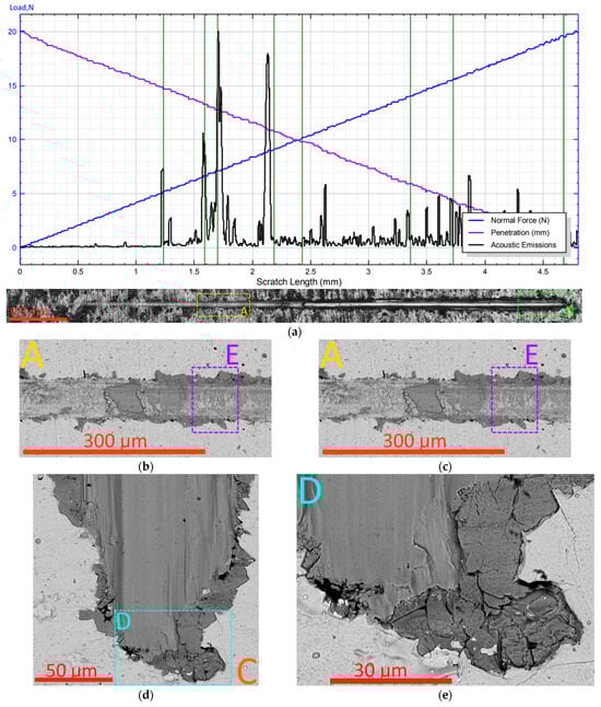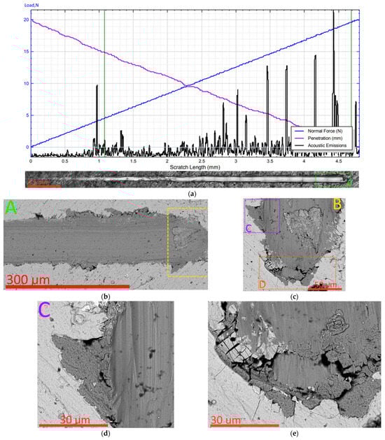 Destruction of the ZrN coating during the scratch test: (a) acoustic emission signal (top) and general view of the scribing groove (bottom), (b) area of complete destruction of the coating (point LC2), (c) destruction of the coating in the area of the end of the groove (area B), (d) area of destruction of the coating C, (e) area of destruction of the coating D.