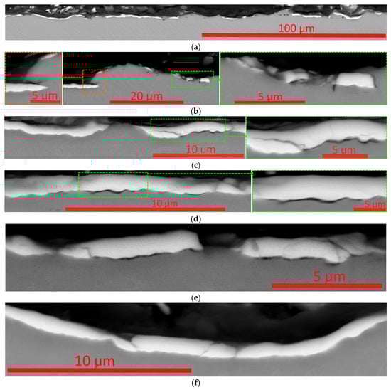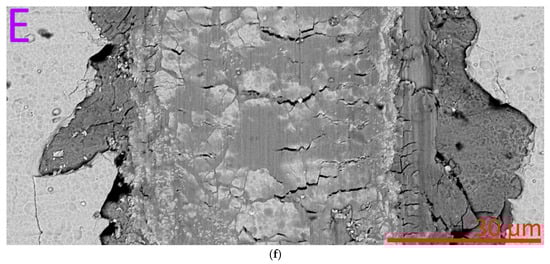 A study of a transverse section passing through a ribbing groove is presented in Figure 12. In Figure 12a, there is a shaft of plastic deformation of the substrate at the boundary of the scribing groove (left side of the image). The shaft formed as a result of plastic deformation floats onto the coating. On the other (right) side, you can see the imprinting of coating fragments into the substrate material. The destruction of the coating occurs both as a result of the formation of cracks (oblique and transverse, see Figure 12b,e) and as a result of detachment from the substrate (Figure 12b–d).