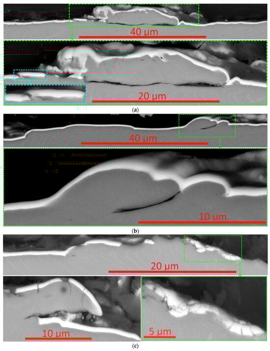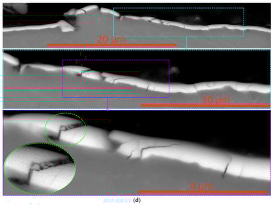 Data on the high strength of the adhesive bonds between the coating and the substrate are confirmed when studying a transverse section made perpendicular to the scribing groove (Figure 10a–c). Detachment of the coating from the substrate is not observed even under conditions of extreme plastic deformation. Directly in the scribing furrow, both transverse and longitudinal cracks are formed in the coating structure, as well as cracks of a combined type (Figure 10c,d).
