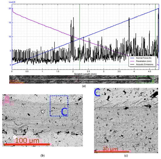 The scratch test was carried out using a CB-500 tester (Micro Scratch, Nanovea, Irvine, CA, USA) in accordance with the ASTM C1624-22 method [], measuring the load from 0 to 40 N.