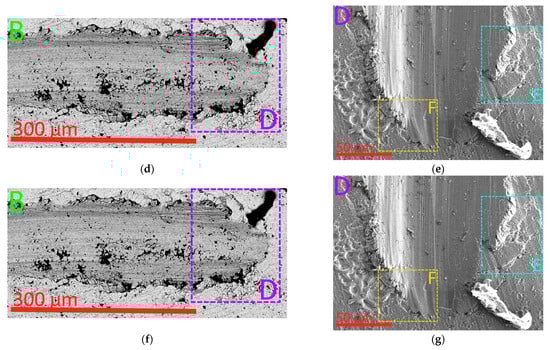 Destruction of the (Ti,Zr,Nb)N coating during the scratch test: (a) acoustic emission signal (top) and general view of the scribing groove (bottom), (b,c) the area where cracking begins in the coating, (d) area of complete destruction of the coating, (e) failure of the coating at the end of the furrow (area B), (f) failure area of coating E, (g) area of failure of coating F.