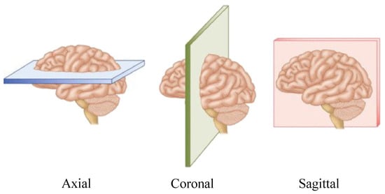 For this reason, delineating or identifying the tumor area poses a challenge for experts, as it relies on the clinician’s expertise and visual acuity to discern the suspected tumors in the MRI images []. The scientific community has recognized the crucial role of early tumor detection in saving lives; substantial efforts have been devoted to developing intelligent systems in healthcare, specifically for brain cancer. Unlike X-rays, MRI allows for visualizing internal body structures without being hazardous. One of the primary uses of MRI in the medical field is to precisely image the internal structures of the brain, specifically the soft tissues. These images present three-dimensional scans of the patient’s brain, which can be viewed in any of its three corresponding image planes: axial, coronal, and sagittal [], as shown in Figure 1.