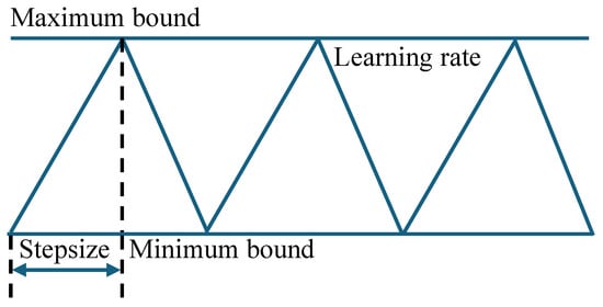 The cyclical learning rate (CLR) [] is a method that establishes a dynamic learning rate, fluctuating between lower and higher values at regular intervals during the training process, as illustrated in Figure 3.