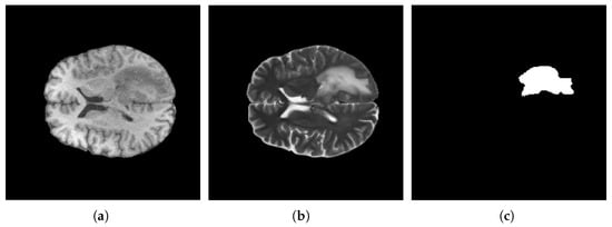 The influence of T1 and T2 contrasts on the image masks: unveiling their different effects and implications for image processing in the BraTS 2021 dataset. (a) T1 sequence, (b) T2 sequence, and (c) Mask.