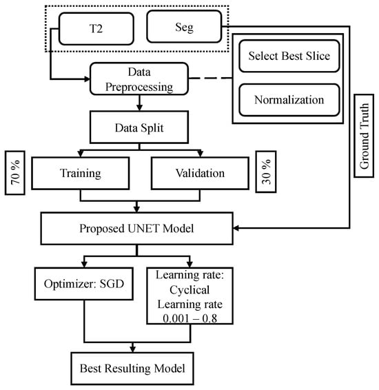 Figure 5 shows the functional blocks used to implement the proposed architecture. The BraTS databases provided the diverse modalities of images required to test the proposed algorithms. Such images are preprocessed for signal and image better conditioning to continue with data normalizing. Next, 70% of the data are randomly chosen for training, and the remainder is used for validation purposes. Stochastic Gradient Descent (SGD) was used as the optimizer to minimize the loss function with a cyclical learning rate to help avoid local minima. Finally, the lightweight UNET focused on tumor detection is tested and evaluated. A highly sensitive strategy to select the dynamic learning rate provided a reliable optimization process during network convergence.
