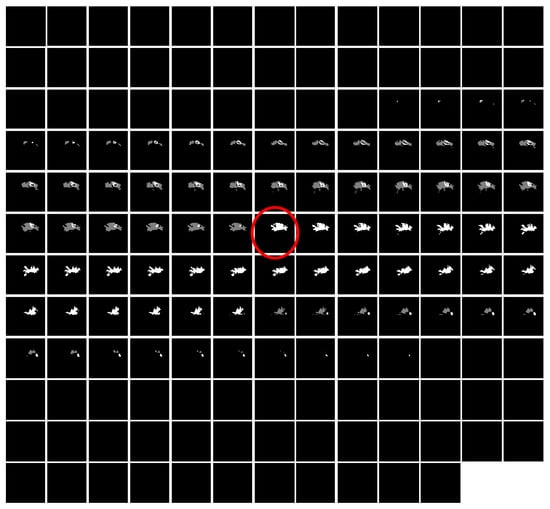 In contrast to some works in the literature, where the whole 3D sequence was analyzed or where a mixture of image modalities was employed, in this work, the best slice of the T2 voxel image was selected with the help of the ground truth image. This ground truth image contains 155 slices, as shown in Figure 6, which captures the different 3D regions of the brain tumor. This way, the slice with the highest tumor content was selected to minimize the computational cost, obtaining 140, 240, and 277 images for each dataset.