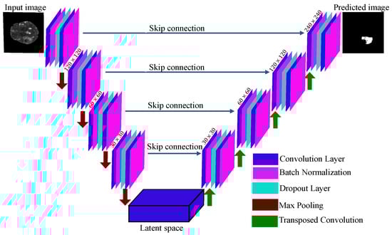 The proposed model is illustrated in Figure 7. It is based on the UNET architecture but with some improvements. The initial filter count is reduced, and an adaptive learning rate and activation function are incorporated into each block. The model has four levels, each with two convolution blocks of 3 × 3 pixel filters. The first level’s convolution block has 16 filters, which increase to 32, 64, 128, and 256 in the subsequent levels. Additionally, each level includes two batch normalization blocks (one after each convolution) and a 2 × 2 pixel max pooling, which reduces the dimension by half in each level. Lastly, a dropout layer is added between each convolution and batch normalization pair.