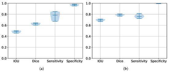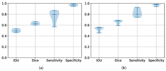 Finally, the dispersion observed for the BraTS 2021 dataset was notably reduced compared to previous databases even with the implementation of cyclical learning rates, as shown in Figure 10. The variability observed between the cyclical learning rate (CLR) and fixed learning rate models can be attributed to several factors. The CLR strategy, by periodically adjusting the learning rate, enables the model to escape local minima and explore different regions of the loss landscape. For instance, Figure 10b shows that the modified UNET model yielded average values of 0.6070 ± 0.011, 0.721 ± 0.007, 0.872 ± 0.003, 0.973 ± 0.0003, for IoU, DSC, Sensitivity, and Specificity, respectively.