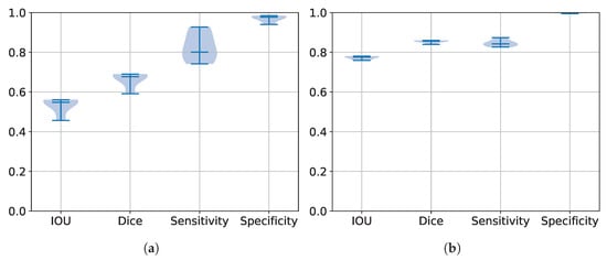 - Zou, K.H.; Warfield, S.K.; Bharatha, A.; Tempany, C.M.; Kaus, M.R.; Haker, S.J.; Wells, W.M.; Jolesz, F.A.; Kikinis, R. Statistical validation of image segmentation quality based on a spatial overlap index1: Scientific reports. Acad. Radiol. 2004, 11, 178–189. [Google Scholar] [CrossRef] [PubMed]