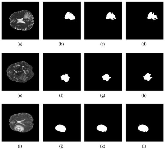 Visualization of brain tumor segmentation employing the BraTS 2020 dataset. (a,e,i) Original images; (b,f,j) UNET base; (c,g,k) UNET modified; and (d,h,l) Target images.