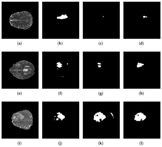 In a significantly reduced quantity, there were also unsatisfactory results in this research. Figure 14 shows some instances where the proposed model fails to segment the entire content of the unhealthy tissue as well as incorrectly segmenting areas where the tumor was not present. Figure 14i presents the original image for the mask given in Figure 14l, where the base model yielded the reference values of 0.785, 0.879, 0.962, 0.988, and 67.80 for IoU, DSC, Sensitivity, Specificity, and Hausdorff distance, respectively. On the other hand, Figure 14k shows the modified or proposed model, yielding 0.582, 0.736, 0.588, 0.999, and 13, for IoU, DSC, Sensitivity, Specificity, and Hausdorff distance, respectively. It is essential to notice that the Hausdorff distance was higher for Figure 14j compared to Figure 14k, whereas the IoU metric showed the opposite behavior. This discrepancy occurs because the IoU measures the overlap between the mask and predicted images, while the Hausdorff distance measures the distance between their corresponding contours.