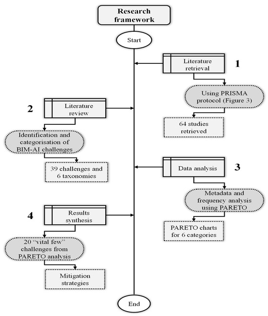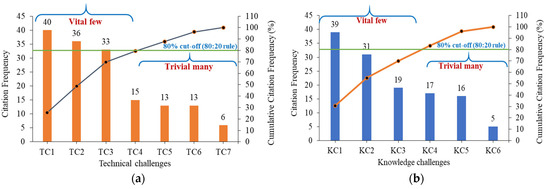 where µj denotes the mean citation frequency of a taxonomy of the challenges, Cj represents the citation frequency of a challenge in each taxonomy, and n denotes the number of challenges in a taxonomy. The mean citation frequencies were used to rank the taxonomies of the challenges of BIM-AI integration in the construction industry. Lastly, Pareto analysis was conducted to prioritise the vital few challenges in each taxonomy. Pareto analysis ranks data classifications in descending order, from the highest to the lowest citation frequencies [24]. It is based on the heuristic of the “80/20” rule. In a Pareto chart, the total (cumulative) frequency is equated to 100%, such that the “vital few” challenges occupy a substantial amount (80%) and the “trivial many” occupy only the remaining 20% of the cumulative citation frequencies [25]. This study used Pareto charts to identify and develop a conceptual map of the most important challenges of BIM-AI integration in the construction industry. Subsequently, the study developed a mitigation strategy comprising targeted interventions to address the challenges reported in each taxonomy.