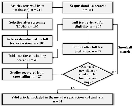 The filtered search retrieved 211 articles. After an initial screening of the Titles, Abstracts, and Keywords, 107 potentially relevant articles were identified. These articles were downloaded for full-text evaluation against the inclusion and exclusion criteria. The rigorous full-text evaluation highlighted 37 articles that addressed the challenges of BIM-AI integration. To increase the sample size and achieve a comprehensive coverage of the relevant studies, the 37 relevant articles formed the basis for forward and backward snowball searches [22]. The backward snowballing involved searching the reference lists of the included studies to identify additional relevant articles. The forward snowballing involved using Scopus to track the articles that cited the eligible articles. The new studies identified from the snowballing search became subjects of further forward and backward snowballing until no new studies were found. The snowballing strategy helped gather 27 additional relevant articles, increasing the valid sample size to 64 articles. Figure 3 shows the literature search and selection procedures. Appendix A (Table A1) summarises the references to the reviewed articles.