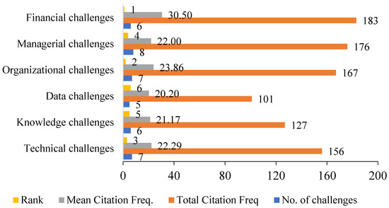 The number and total citation frequencies of the identified challenges facilitate the computation of the mean citation indices of the taxonomies. Figure 4 shows the number (n) of challenges, total citation frequencies (∑), and mean citation frequencies (μ) of the taxonomies, including technical (n = 7, ∑ = 156, μ = 22.29), knowledge (n = 6, ∑ = 127, μ = 21.17), data (n = 5, ∑ = 101, μ = 20.20), organisational (n = 7, ∑ = 167, μ = 23.86), managerial (n = 8, ∑ = 176, μ = 22.00), and financial (n = 6, ∑ = 183, μ = 30.50) challenges.
