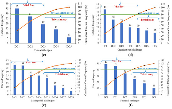 Pareto charts of the taxonomies of the challenges to BIM-AI integration. (a) Technical challenges; (b) knowledge-related challenges; (c) data-related challenges; (d) organisational challenges; (e) managerial challenge; (f) financial challenges.