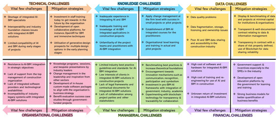 Addressing the various challenges in BIM-AI integration through targeted mitigation strategies not only enhances technical compatibility, knowledge, and organisational readiness, but also improves data quality and ensures financial feasibility, ultimately driving successful implementation across the construction industry through addressing these issues [39,40].