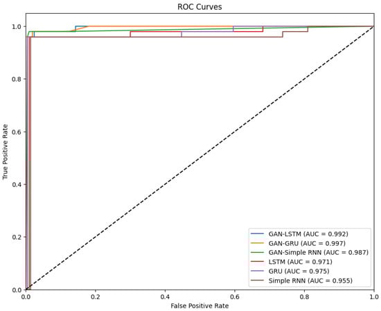 The GAN-LSTM model also performed exceptionally well, with a sensitivity of 0.990, specificity of 0.995, precision of 0.979, an F-measure of 0.984, and AUC of 0.992, demonstrating the effectiveness of combining GAN with LSTM for this application. Meanwhile, the GAN-Simple RNN model, although slightly less effective, still achieved impressive results with a sensitivity of 0.960, specificity of 0.991, precision of 0.962, and an F-measure of 0.961, along with an AUC of 0.987. In contrast, the standalone models (LSTM, GRU, and Simple RNN) showed lower performance. The LSTM model achieved a sensitivity of 0.901, specificity of 0.990, precision of 0.912, and an F-measure of 0.906, with an AUC of 0.971. The GRU model followed closely with a sensitivity of 0.897, specificity of 0.990, precision of 0.850, an F-measure of 0.873, and an AUC of 0.975. The Simple RNN model had the lowest performance, with a sensitivity of 0.884, specificity of 0.989, precision of 0.870, an F-measure of 0.877, and an AUC of 0.955.