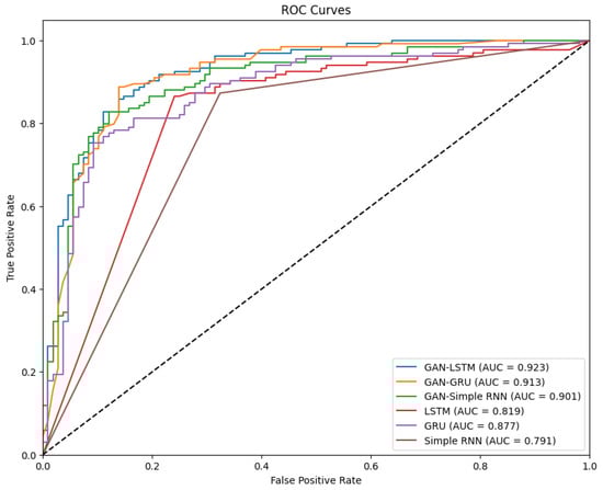 The performance of the various models using the Brazilian dataset is summarized in Table 7 and illustrated by the ROC curves in Figure 4. The results consistently demonstrate the superior performance of the GAN-integrated models over their standalone counterparts. Among the tested models, GAN-LSTM obtained the best performance, achieving a sensitivity of 0.920, specificity of 0.965, precision of 0.988, and an F-measure of 0.953. Its AUC of 0.923 further confirms its effectiveness in accurately distinguishing fraudulent transactions from legitimate ones. Similarly, the GAN-GRU model also exhibited strong performance with a sensitivity of 0.903, specificity of 0.929, precision of 0.951, and an F-measure of 0.926, supported by an AUC of 0.913. The GAN-Simple RNN, while slightly behind, still achieved impressive results with a sensitivity of 0.898, specificity of 0.910, precision of 0.924, an F-measure of 0.911, and an AUC of 0.901.