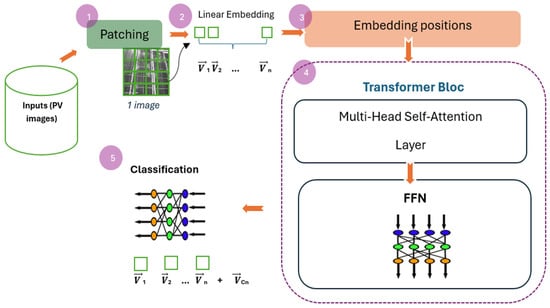 - Output Vector of the Class Token: After processing through the final transformer block, the output vector associated with the class token encapsulates the global representation of the PV image. This vector is then used for the classification task. It demonstrates that the model does not rely on isolated patch features but integrates them into a cohesive and comprehensive representation. This integration ensures that the classification decisions are based on a holistic image understanding, capturing local details, and overarching patterns.