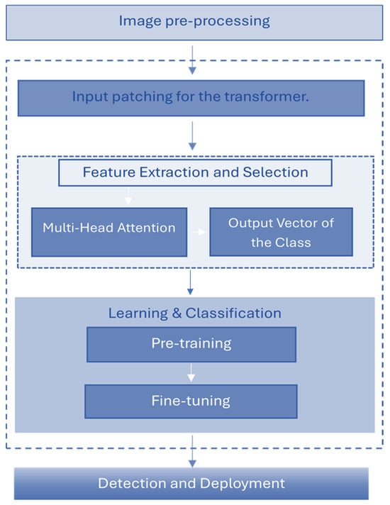 - Classification: At the end of the transformer network, the classification token (a specific vector VClass added to the patch embeddings) is extracted and passed through one or more fully connected layers to perform the final classification task. The ViT architecture is conceptually simpler than deep CNN architectures, as it avoids complex convolutions and successive downsampling. Moreover, the model can be pre-trained on large image databases, reserved for research work, and then adapted to various computer vision tasks with excellent knowledge transfer [37].