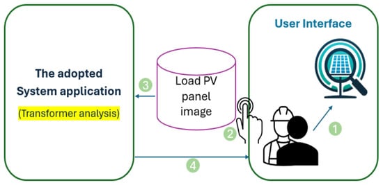 - User Access and Initialization: As a first step (1), users access the application via the user interface. They initiate the process by loading a PV panel image.