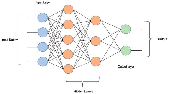- Multi-layer Perceptron (MLP) Neural Network model: The MLP model is effective in estimating PM concentrations. It has a layered structure, consisting of multiple interconnected layers of neurons (See Figure 5). Each node processes input data via weighted connections and uses activation functions to introduce non-linearity. The structure contains an input layer that receives temporal variables (date and time) and meteorological variables (temperature, humidity, and wind speed) that act as explanatory variables. The hidden layers enable the model to learn complex patterns and relationships within the data, and the output layer produces the estimated PM concentration [,].