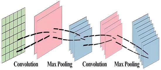 - Convolutional Neural Network (CNN) model: Convolutional neural networks have been widely used in image data processing [,]. This model enhances the estimation accuracy of PM concentrations in different cities such as the United States [] and Kaohsiung []. They use a structured approach, alternating between convolutional and pooling layers (See Figure 6). The convolutional layers extract spatial features from input data, including air quality measurements and meteorological variables. These layers apply filters or kernels to perform convolution operations, which produce feature maps that highlight important patterns associated with PM levels. The pooling layers reduce the size of the convolved features, decreasing the computational resources needed to process the data. This integration of convolutional and pooling layers enables CNNs to effectively learn and estimate PM concentrations from intricate environmental datasets [,,].