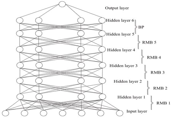 - Deep belief-Back Propagation Network model: The prediction model, leveraging a deep belief neural network integrated with a Back Propagation (BP) neural network, represents a sophisticated hybrid approach that combines the strengths of multiple unsupervised Restricted Boltzmann Machines (RBMs) and supervised BP networks to effectively predict pollutant concentrations, specifically and . As illustrated in Figure 7, this architecture comprises an input layer with 29 nodes dedicated to capturing relevant features of the PM, while the output layer consists of a single node that predicts concentration values. The total number of layers in the network is variable, denoted as n, allowing for flexibility in model complexity; each layer is formed by stacking RBMs followed by BP networks, which enhances the model’s ability to learn intricate patterns in the data [].