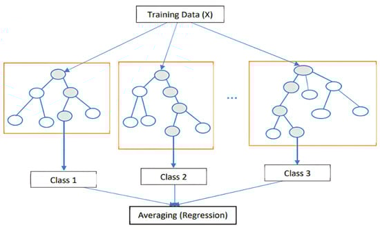 - Random Forest (RF) model: RF is an effective ensemble learning model for estimating PM concentrations. This model generates multiple decision trees to improve the estimation accuracy. The input variables are usually meteorological and environmental parameters like temperature, humidity, wind speed, atmospheric pressure, and PM levels. Each decision tree is built using a bootstrap sample from the training dataset. This allows each tree to be trained on a unique subset of data. The remaining data are then used to estimate the error for that tree. At each node of the decision trees, it selects a random subset of independent variables to determine the best split, promoting tree diversity and reducing overfitting. The final PM concentration is estimated by averaging the outputs of all trees, providing a robust estimate that captures complex environmental interactions [,,,,]. Figure 8 shows the general structure of a random forest regressor.