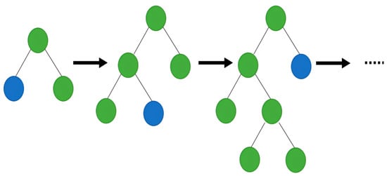 - Light Gradient Boosting Machine (LightGBM) model: This model performs exceptionally well at modeling complex, non-linear relationships between PM concentrations and various environmental variables. The algorithm constructs a decision tree using input features such as traffic patterns, meteorological data, and PM measurements. It uses a gradient boosting approach, where each subsequent tree corrects the errors of the previous ones. LightGBM speeds up training by applying a histogram-based method that bins continuous features into discrete intervals to efficiently calculate potential split points. The splitting in LightGBM follows a leaf-wise approach, selecting the leaf node with the maximum gain to grow and prioritizing the most informative splits to reduce estimation error. This process continues until a stopping criterion, such as a set number of trees or achieving a sufficient level of accuracy, is reached. The final estimation for PM is calculated as the sum of the estimations from all the individual trees in the model [,,]. Figure 10 shows the structure of the LightGBM model.