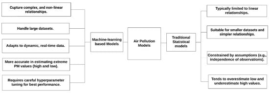 Most statistical models assume a linear relationship between variables when estimating PM concentrations, even though this relationship is non-linear. These models are based on specific assumptions, and to achieve accurate estimates, the data and variables must align with these assumptions. When these conditions are not met, the accuracy of the model can be significantly reduced. This limitation has prompted researchers to turn to ML models for estimating PM concentrations. Although both statistical and machine learning models use similar input data, they handle and process it differently. Unlike statistical models, ML models make fewer assumptions and capture more complex, non-linear relationships in the data, allowing them to achieve higher accuracy [,].