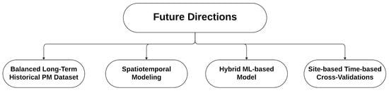 ML emerges as a powerful tool for estimating PM concentrations. ML-based models, when trained on diverse datasets that integrate meteorological and land-use information, can capture complex relationships and provide spatially extensive, low-cost, and accurate estimations of PM concentrations [,]. Accurate estimates allow for better tracking of air pollution levels, helping authorities to identify high-risk areas and reduce exposure to protect public health [,]. Several ML-based models have achieved good results in improving estimation accuracy, for example: