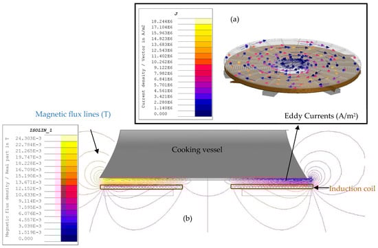 4] employed a computational fluid dynamic (CFD) simulation to model the thermal behavior of a pot of boiling water using a single-coil induction stove. To validate the simulation results, the authors set up an experimental system consisting of a single-coil induction stove, a pot of water, a Keysight Technologies PA2201A power analyzer, and a HIOKI-LR8432 temperature analyzer. The simulation results show a heat transfer efficiency of 83.6%, with an error margin of less than 7% in the experimental data. However, some induction heating systems use multiple coils and time-varying power. To address these complexities, the authors proposed a multidisciplinary methodology for the thermal analysis of boiling water using an induction stove [