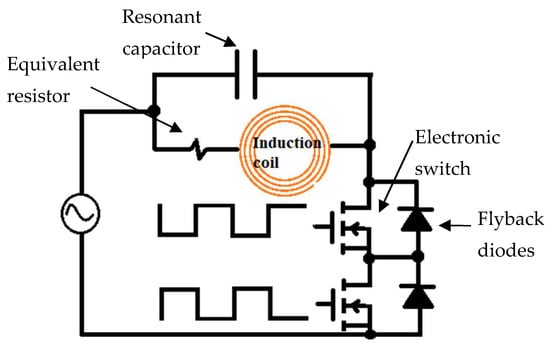 46] carried out a time-domain simulation of a Class E inverter using a single capacitor and a resistor–inductor equivalent network to model the performance of domestic induction stoves in both series and parallel configurations. An experimental prototype was developed with output power levels of 200 W, 600 W, and 1200 W to validate the proposed circuit model. The experimental results indicated that the time-varying current and voltage waveforms were consistent with the simulated results for the series network when the output power was 200 W or 600 W, whereas the output voltage and current showed an error above 19% at 1200 W power. For the parallel network, the waveforms were compatible at output power levels of 600 W or 1200 W. These findings suggest that the proposed circuit model can effectively emulate the behavior of an induction stove, thereby facilitating the design of more efficient systems.