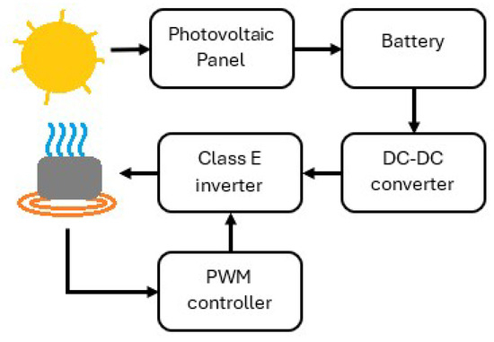 Figure 6, that operates independently of the electrical grid, powered by solar energy. The proposed system comprises a solar panel, a battery, a DC–DC converter in boost mode, and a class E inverter. A PWM controller is used to control the power generated by the stove. The PWM controller detects the presence of the pot, and the power delivered by the coil in order to modify the gate signal of the electronic switch of the class E inverter. This type of solution not only addresses environmental concerns associated with conventional cooking methods but also offers a viable option for areas without access to the electrical grid.