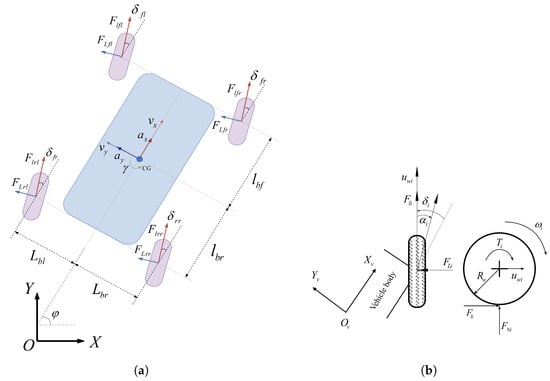 4WISD vehicle dynamics model []. (a) Vehicle body dynamics model. (b) Tire lateral dynamics model (left) and tire longitudinal dynamics model (right).