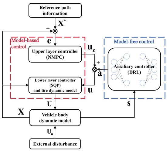 where represents the error state vector between the reference state and the system state, is the reference state vector, is the system state vector, is the bounded external disturbance vector, is the inversion of vehicle mass matrix, is the output of the DRL auxiliary controller, and is the output of the upper-layer controller, respectively.