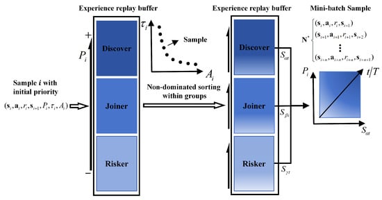 To improve the stability and convergence of the DRL training process and avoid becoming trapped into local optima, the principles of group intelligence optimization are incorporated into the experience replay mechanism. Data in the experience buffer are regarded as an intelligent group [], and the samples in the experience buffer are divided into three distinct functional groups based on the TD error and advantage function value. Non-dominated sorting and training progress are then introduced for within-group and between-group collaboration to optimize data replay and storage []. The discover group provides a better direction for the convergence of the DRL training process by prioritizing the learning of novel state-action pairs. The joiner group focuses on replaying a higher proportion of excellent samples around the discover group, reinforcing and optimizing known high-value policies. The risker group filters out low-quality samples to avoid learning from high-risk samples that may cause overfitting.