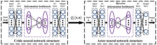 In the standard actor-critic architecture, the critic network estimates the state-action value function, while the actor network generates policies. Building upon this framework, we employ the two-stream information bottleneck (TIB) [] to enhance the algorithm’s generalization capability and policy quality, as shown in Figure 4. In the critic network, we integrate an IB module prior to Q-value estimation, which extracts a D dimensional compact representation from high-dimensional features . The representation minimizes mutual information with high-dimensional features while preserving essential information for Q-value estimation. For the actor network, we integrate a reverse information bottleneck (RIB) module before the policy generation module, which extracts a K-dimensional expressive representation from high-dimensional features . The representation maximizes mutual information with actions and retains discriminative state-action correlations. The extracted latent representations and are subsequently utilized in the critic and actor networks, respectively, to formulate the state-action value function and policy as follows: