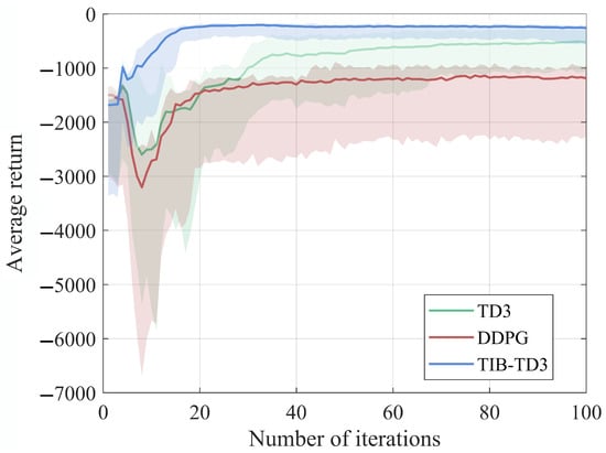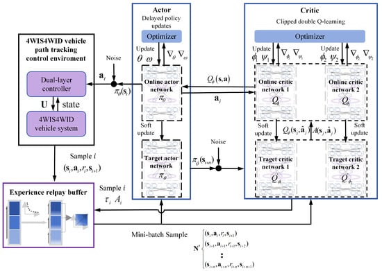 The twin-delayed deep deterministic policy gradient algorithm (TD3) employs two independent Q-networks and adopts the smaller Q-value for policy updates, thereby suppressing overestimation. Moreover, TD3’s deterministic policy gradient is suitable for continuous action space problems []. This algorithm provides enhanced stability for path tracking control of 4WISD vehicles. In what follows, the improved control framework is integrated with TD3.