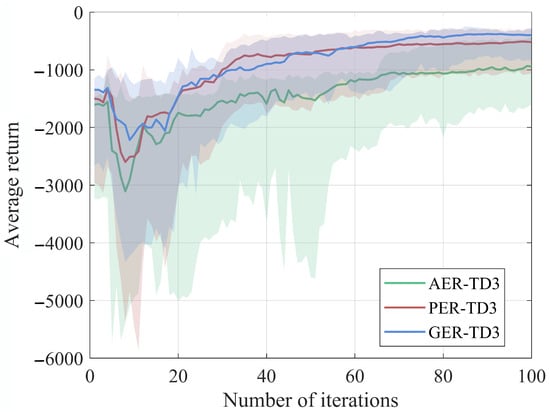 where , , and denote the updated sampling proportions for three groups, respectively. Samples are drawn from , , and according to the values of , , and to obtain replay samples. In the initial stage of training, is large, which allows for the exploration of new and valuable state-action pairs. As training progresses, gradually decreases while increases, which progressively transfers valuable samples discovered during exploration to for sufficient utilization. However, remains small to ensure that a low proportion of low-priority samples participates in training, which enhances the model’s generalization capability.