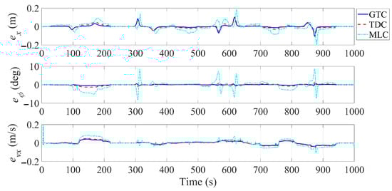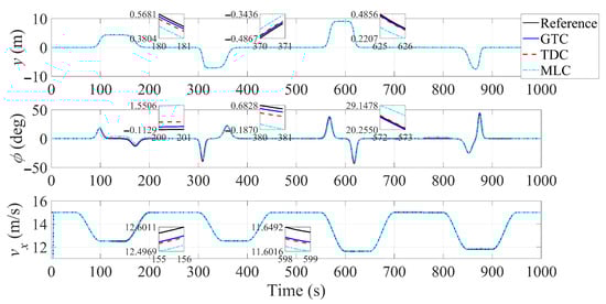 where denotes the dynamic function of the 4WISD vehicle; denotes the auxiliary controller; denotes the upper-layer controller; denotes the lower-layer controller; represents the reference path states of the longitudinal velocity, lateral velocity, and yaw velocity obtained from the lateral displacement Y and yaw angle through differential operation, respectively; and represents the DRL action. Since the DRL auxiliary controller is expected to achieve real-time control of the vehicle based on the vehicle’s current state, we define the state of the DRL as