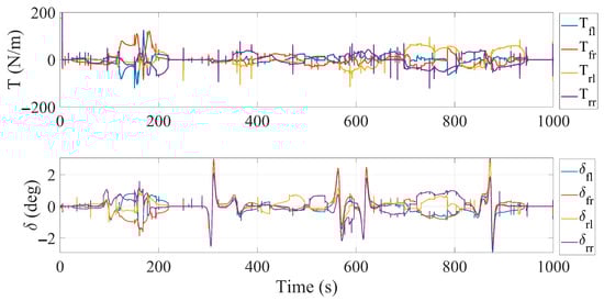 where the matrix represents the torque and steering angle of the front left, front right, rear left, and rear right wheels, respectively. The vehicle state matrix is defined as :