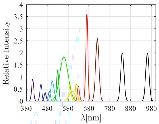 - Monsalve, M.A.T.; Osorio, G.; Montes, N.L.; Lopez, S.; Cubero, S.; Blasco, J. Characterization of a Multispectral Imaging System Based on Narrow Bandwidth Power LEDs. IEEE Trans. Instrum. Meas. 2020, 70, 2000111. [Google Scholar] [CrossRef]