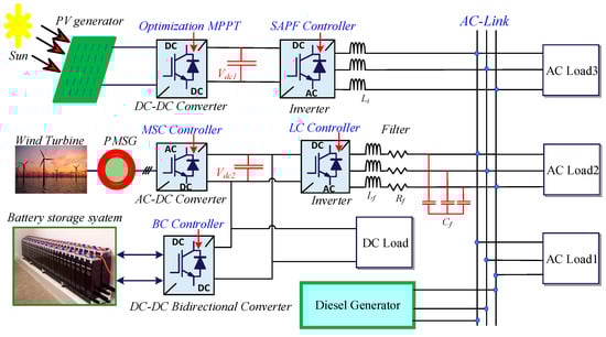 Ibrahim, A.-W.; Xu, J.; Al-Shamma’a, A.A.; Farh, H.M.H.; Aboudrar, I.; Oubail, Y.; Alaql, F.; Alfraidi, W. Optimized Energy Management Strategy for an Autonomous DC Microgrid Integrating PV/Wind/Battery/Diesel-Based Hybrid PSO-GA-LADRC Through SAPF. Technologies 2024, 12, 226. https://doi.org/10.3390/technologies12110226